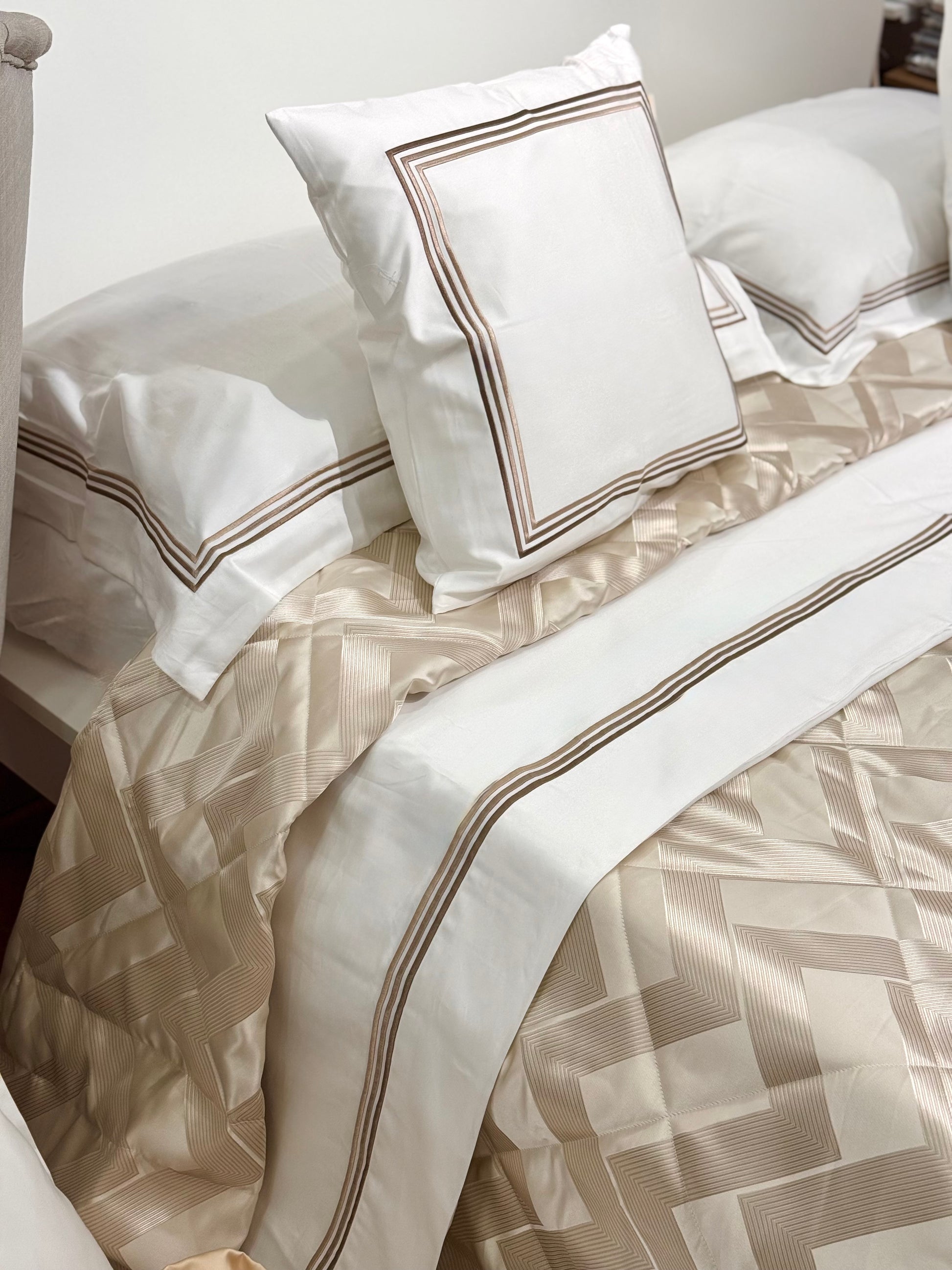 L’eleganza è esaltata da un doppio ricamo decorativo, realizzato con cura artigianale, che corre lungo il bordo, donando un tocco di stile classico e senza tempo. Perfetto per completare una camera da letto sofisticata o come idea regalo di pregio.
