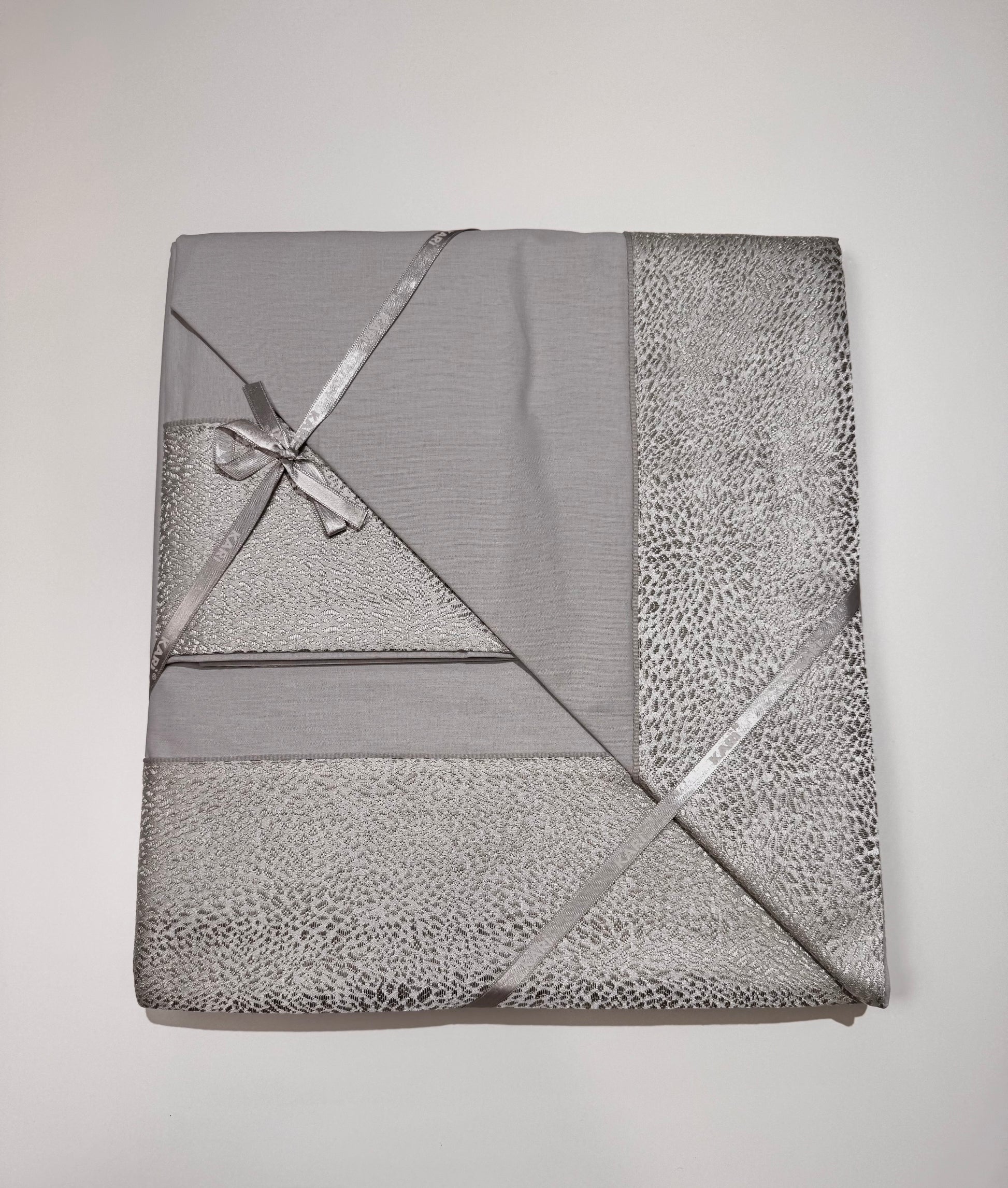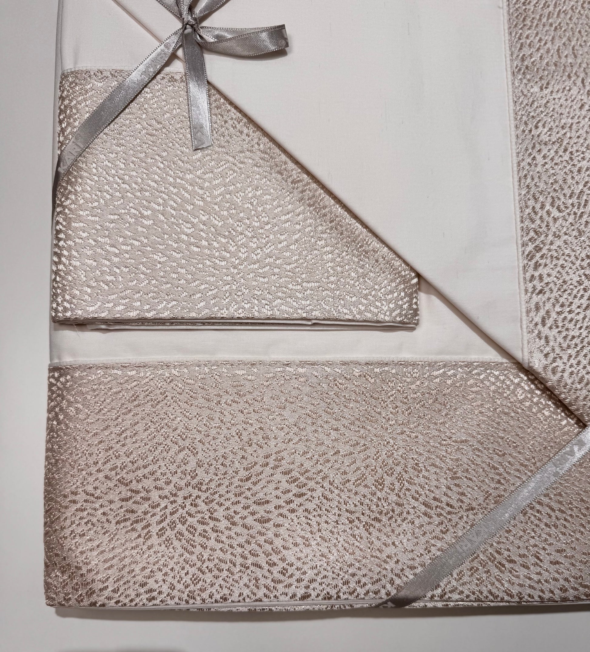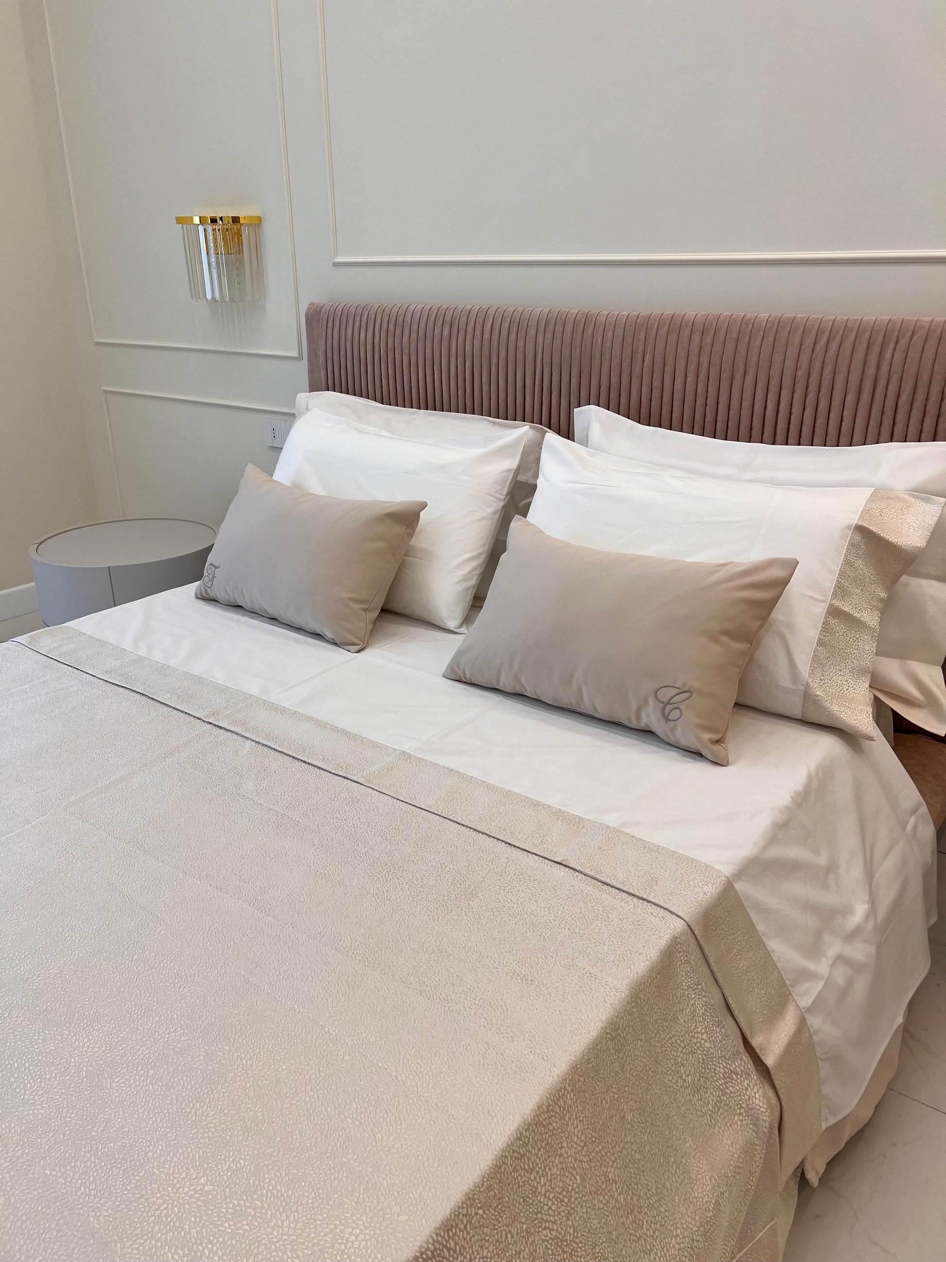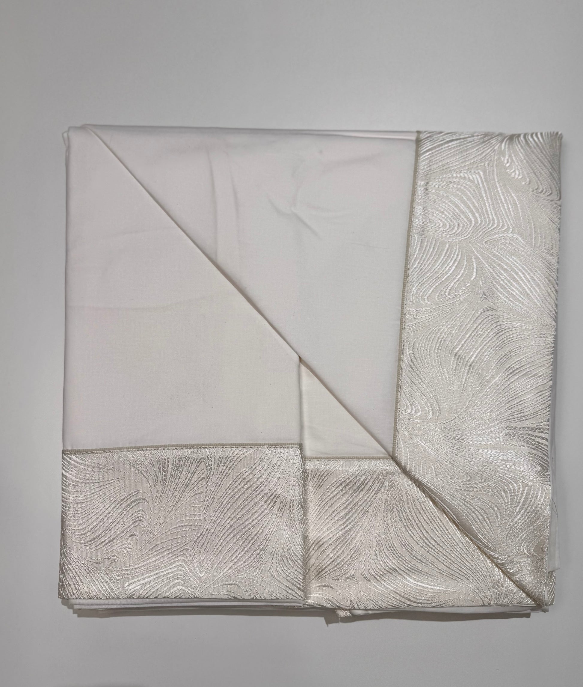 Il Completo lenzuola in puro cotone con bordo in damascato, sul lenzuolo e sulle federe, sotto tinta unita.