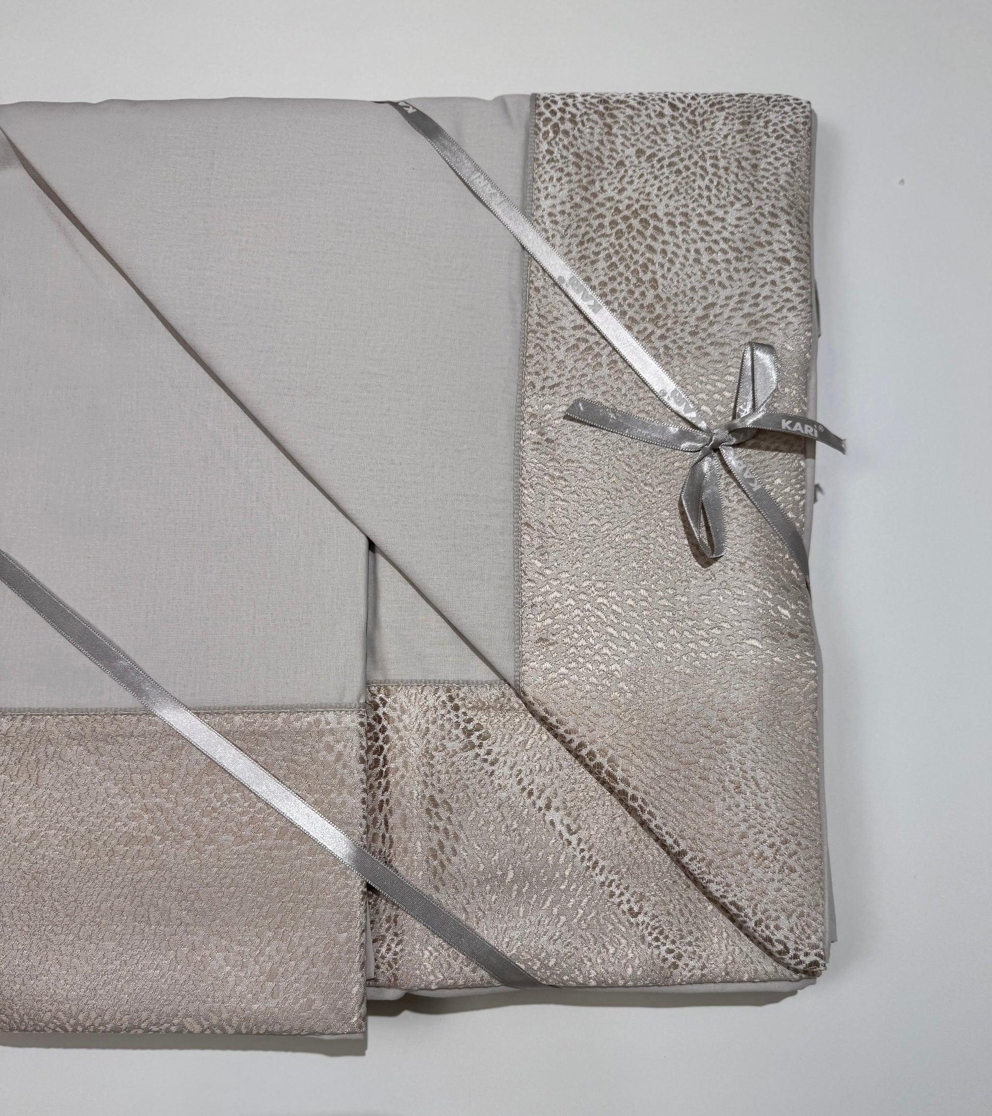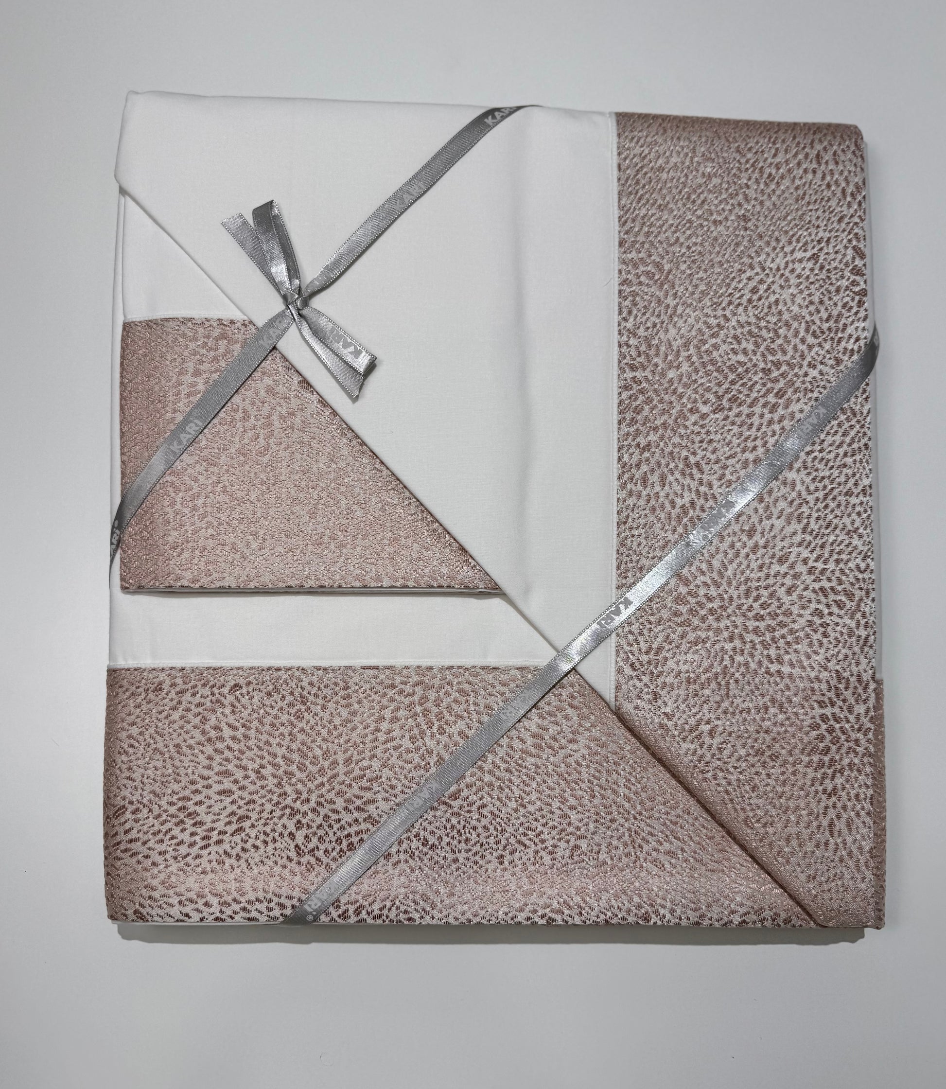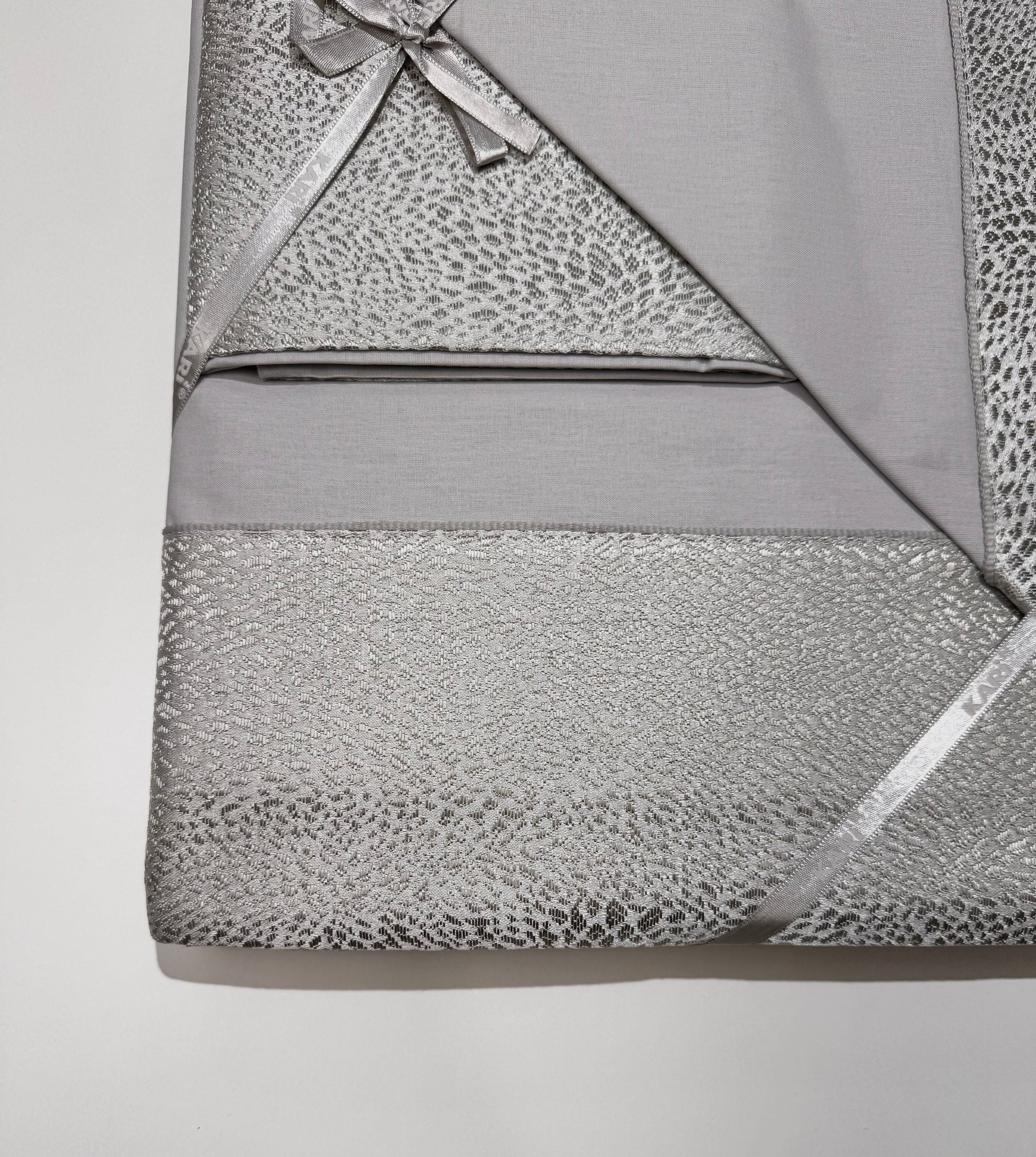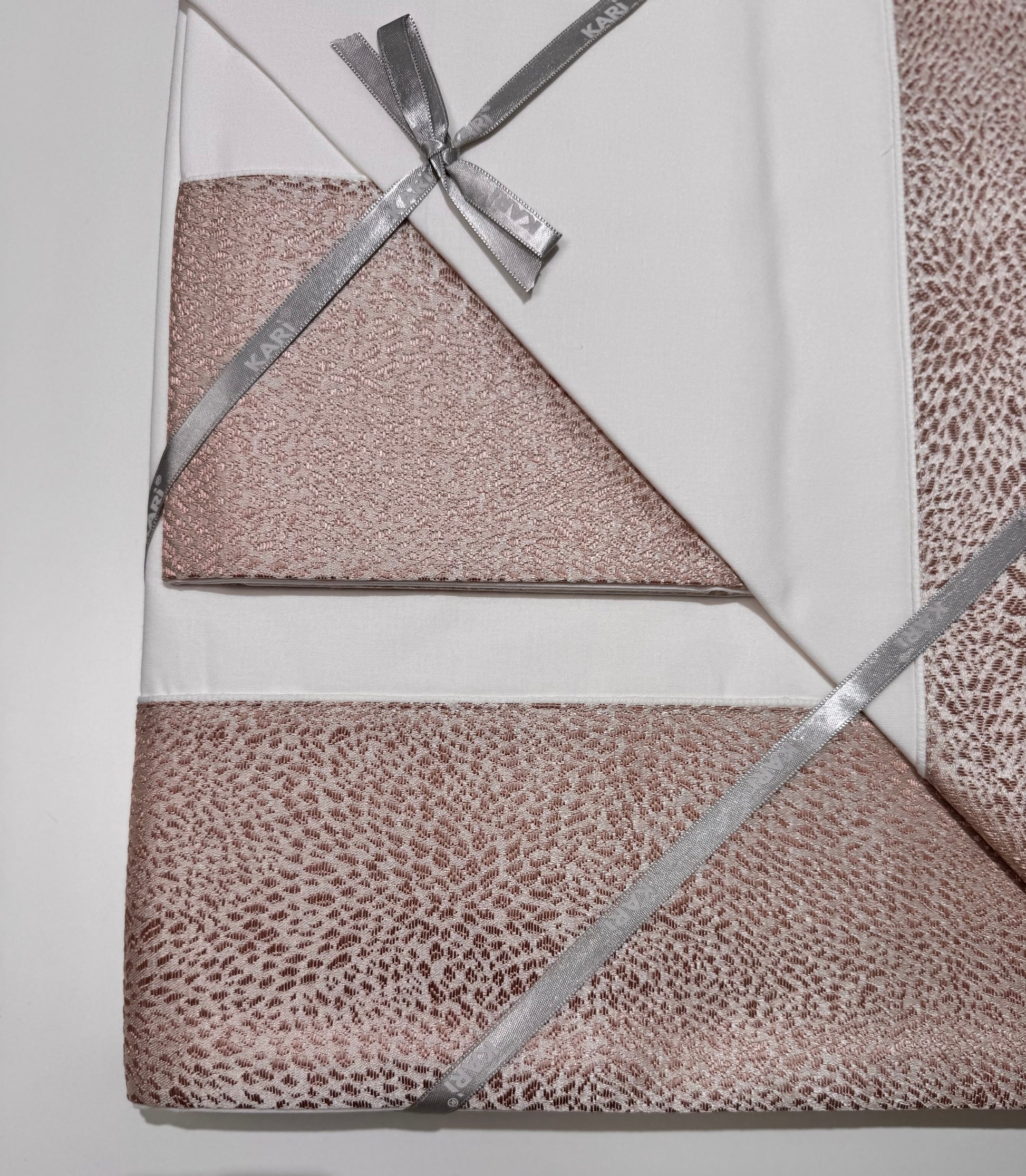 Il Completo lenzuola in puro cotone con bordo in damascato, sul lenzuolo e sulle federe, sotto tinta unita.