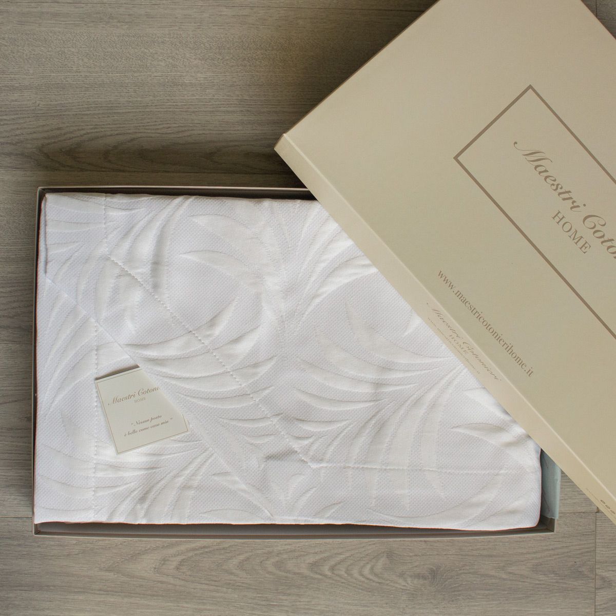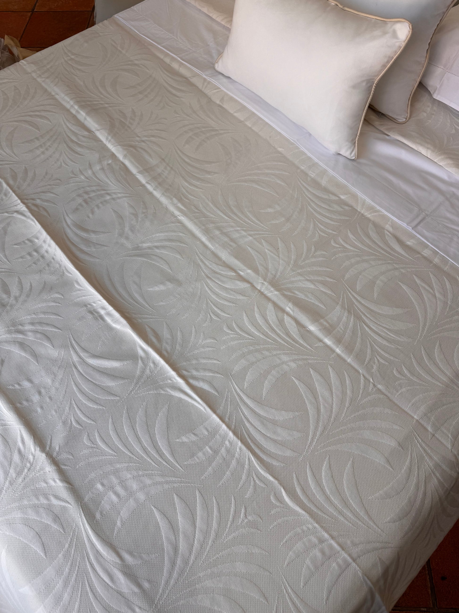 La caratteristica principale del copriletto palma è il motivo floreale che rappresenta delle foglie di palme ricamate. È realizzato in cotone 100%, il copriletto è morbido, traspirante e ideale per tutte le stagioni, assicurando comfort e praticità.