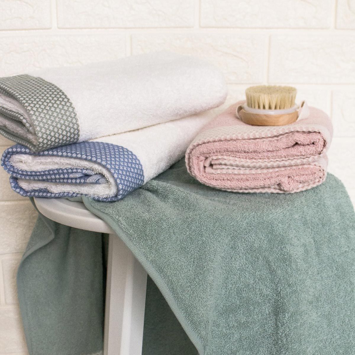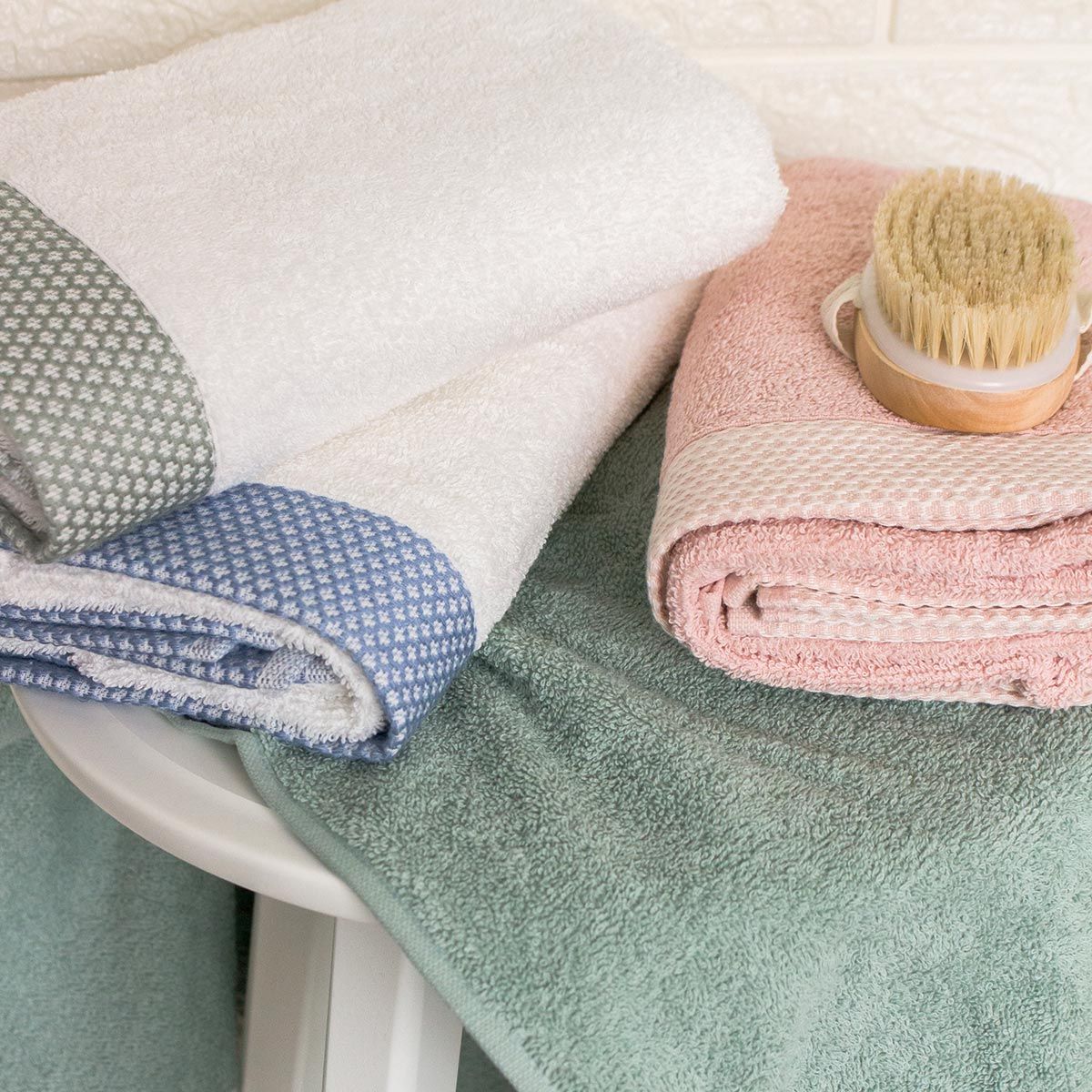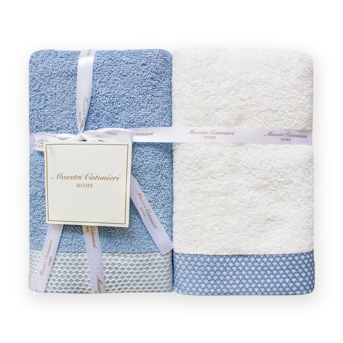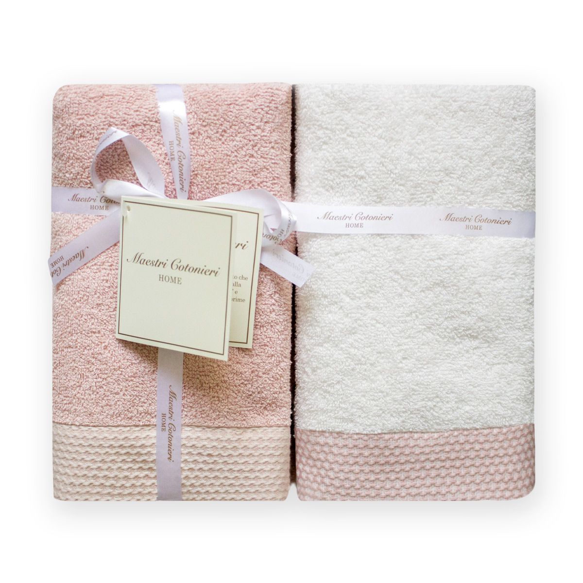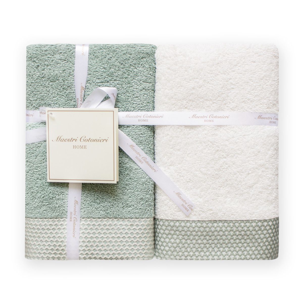 Il set asciugamani Elisir di Maestri Cotonieri Home è composto da due asciugamani grandi e due asciugamani ospiti.