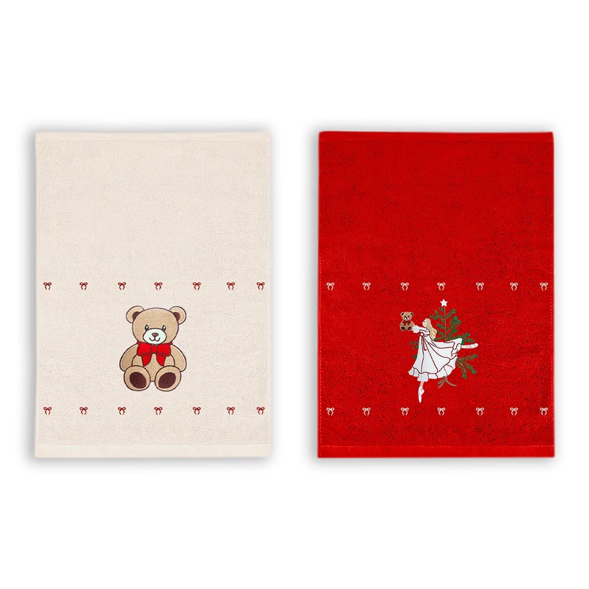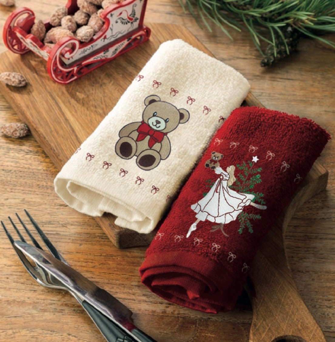 Coppia di morbidi strofinacci in spugna natalizi, decorati con un dolce orsacchiotto e una graziosa ballerina. Perfetti per aggiungere un tocco festoso alla tua cucina. Confezionati in una pratica e raffinata busta regalo.