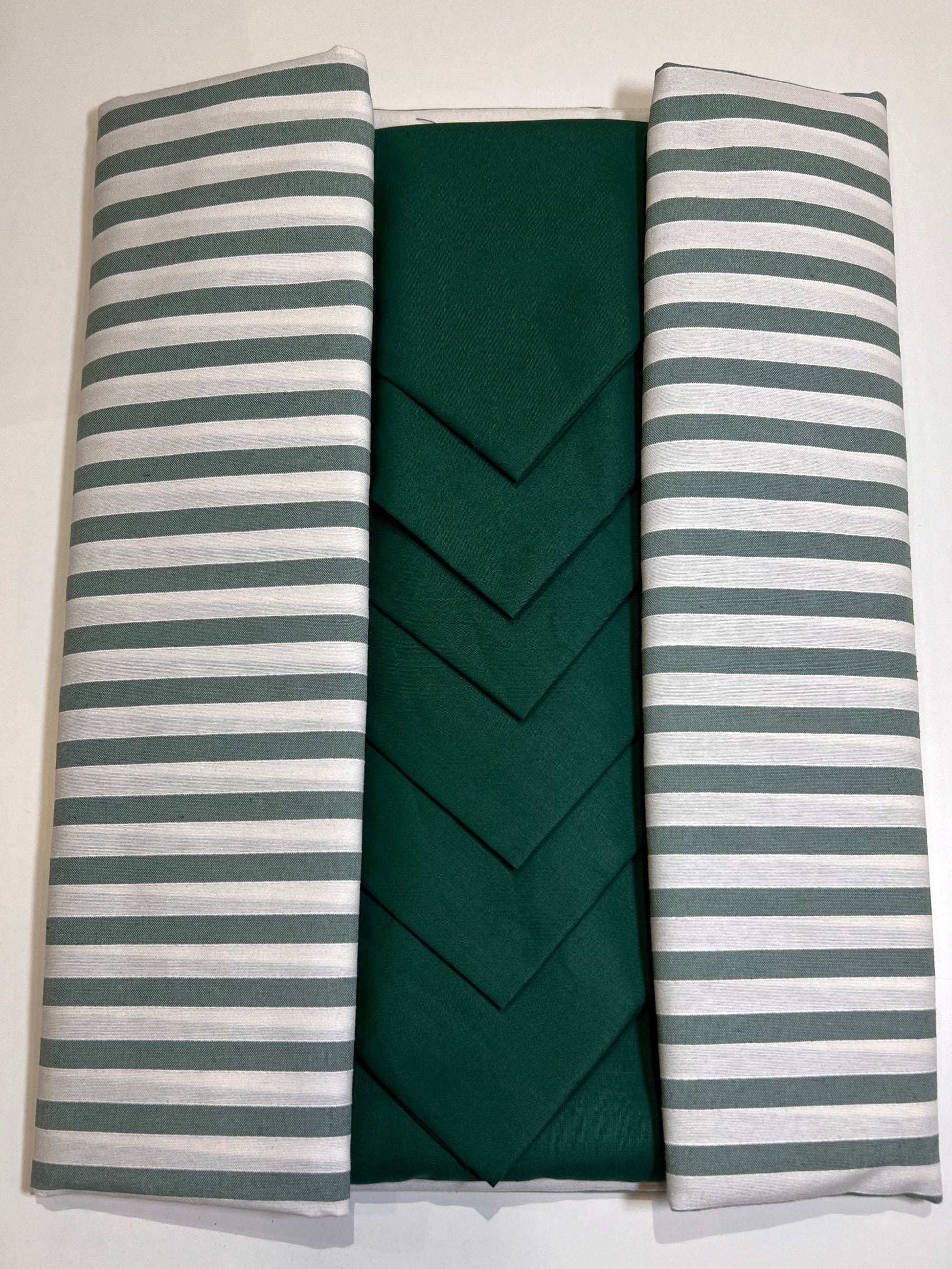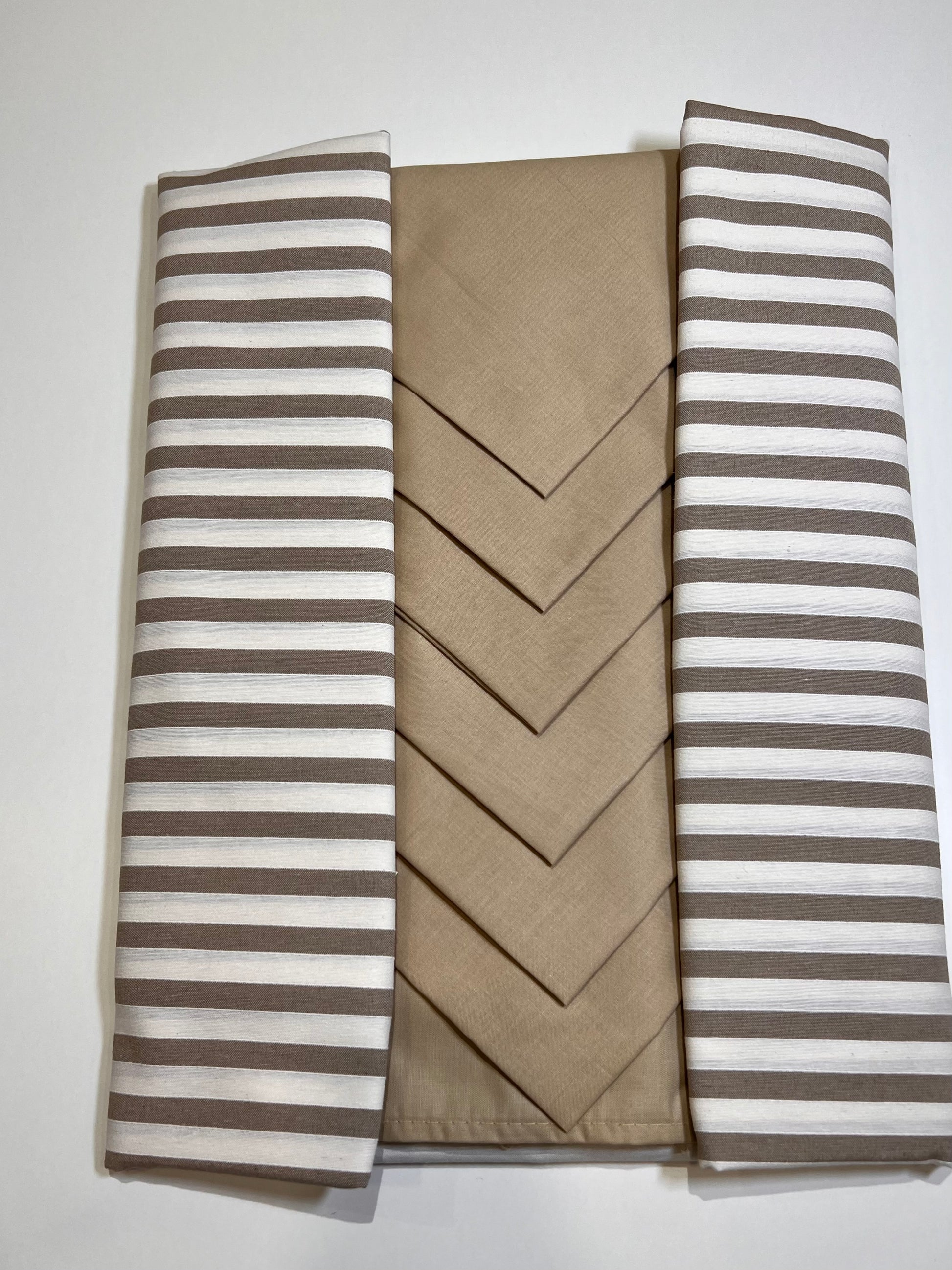 Il servizio ERCHIE é realizzato in puro cotone fantasia a righe disponibile in due varianti di colore: verde salvia e tortora.