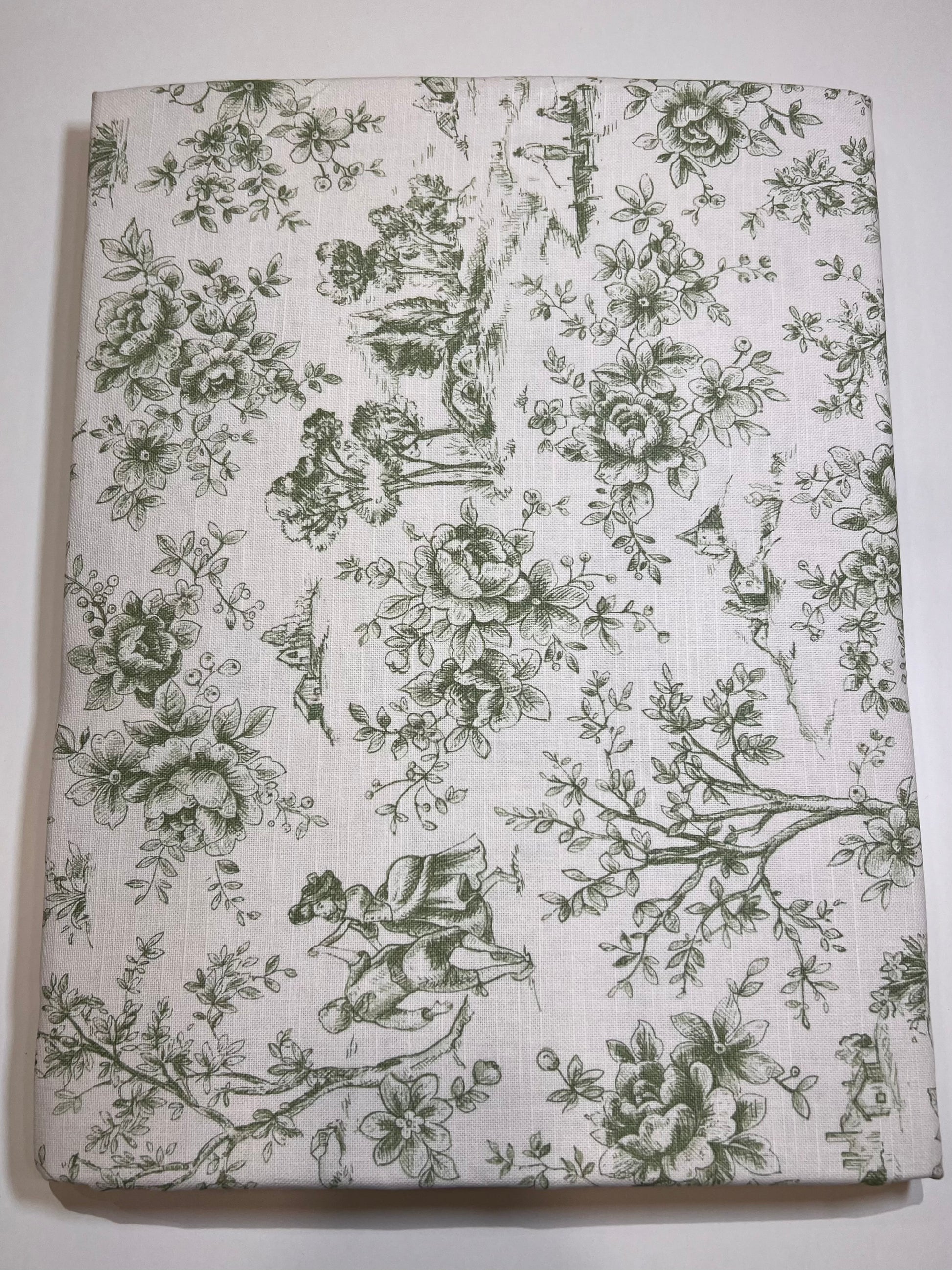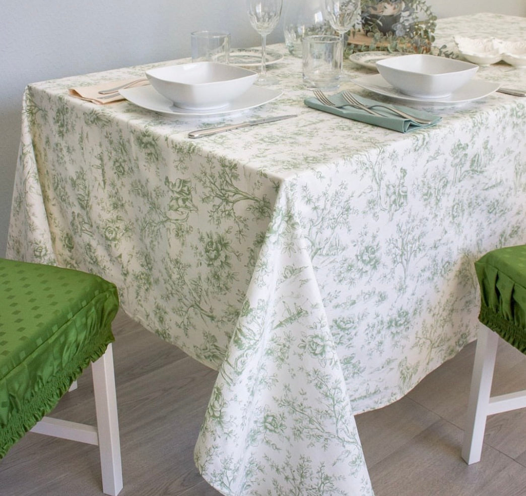 Servizio TOILE DE JOUY splendida nella sua variante verde salvia, tessuto in 100% cotone comprensiva di tovaglioli a contrasto.