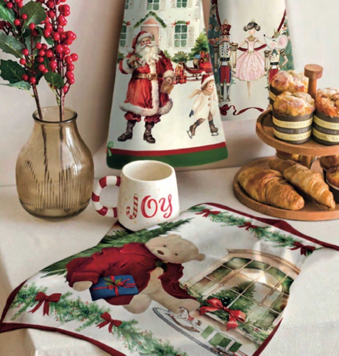 Strofinacci in puro cotone con fantasie natalizie, ideali per portare in cucina la magia e il calore delle feste. Morbidi, assorbenti e ricchi di dettagli, rendono ogni momento ai fornelli ancora più speciale e festoso.