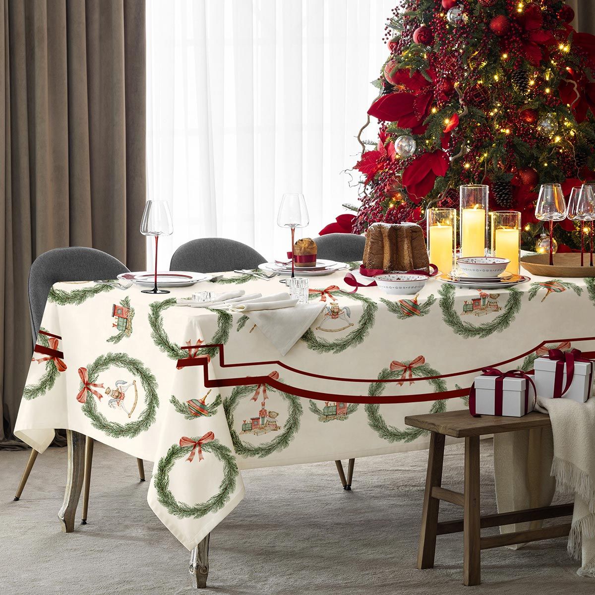 Rendi la tua tavola protagonista delle feste con la tovaglia natalizia Dondolo firmata Maestri Cotonieri Home. Realizzata in 100% cotone e impreziosita da stampa digitale ad alta definizione, unisce qualità, eleganza e praticità, trasformando ogni pranzo o cena in un momento speciale.
