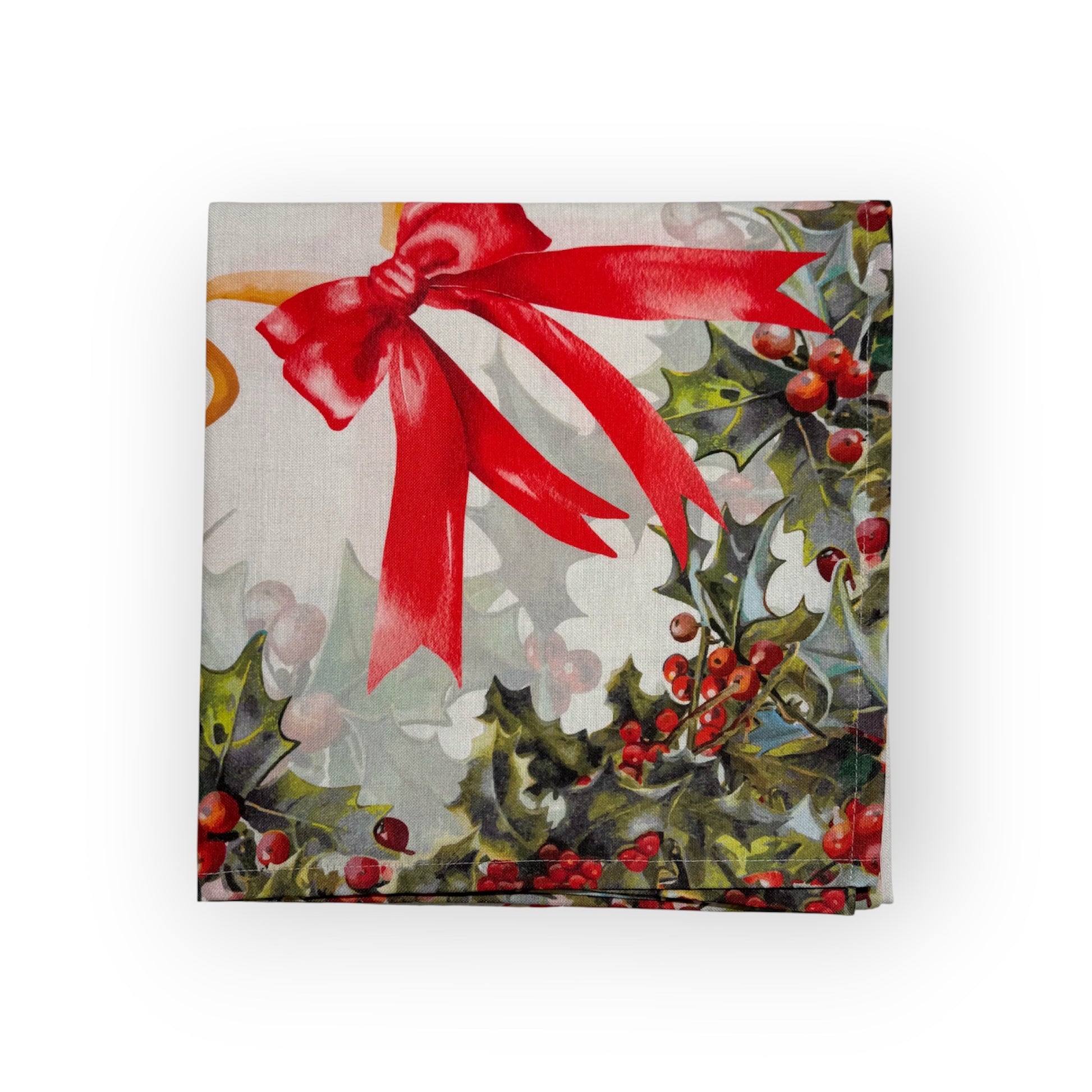Tovaglia natalizia in cotone con stampa piazzata di palline e bacche, nei classici toni del rosso e del verde. Elegante e festosa, dona un tocco raffinato e accogliente alla tavola delle feste.