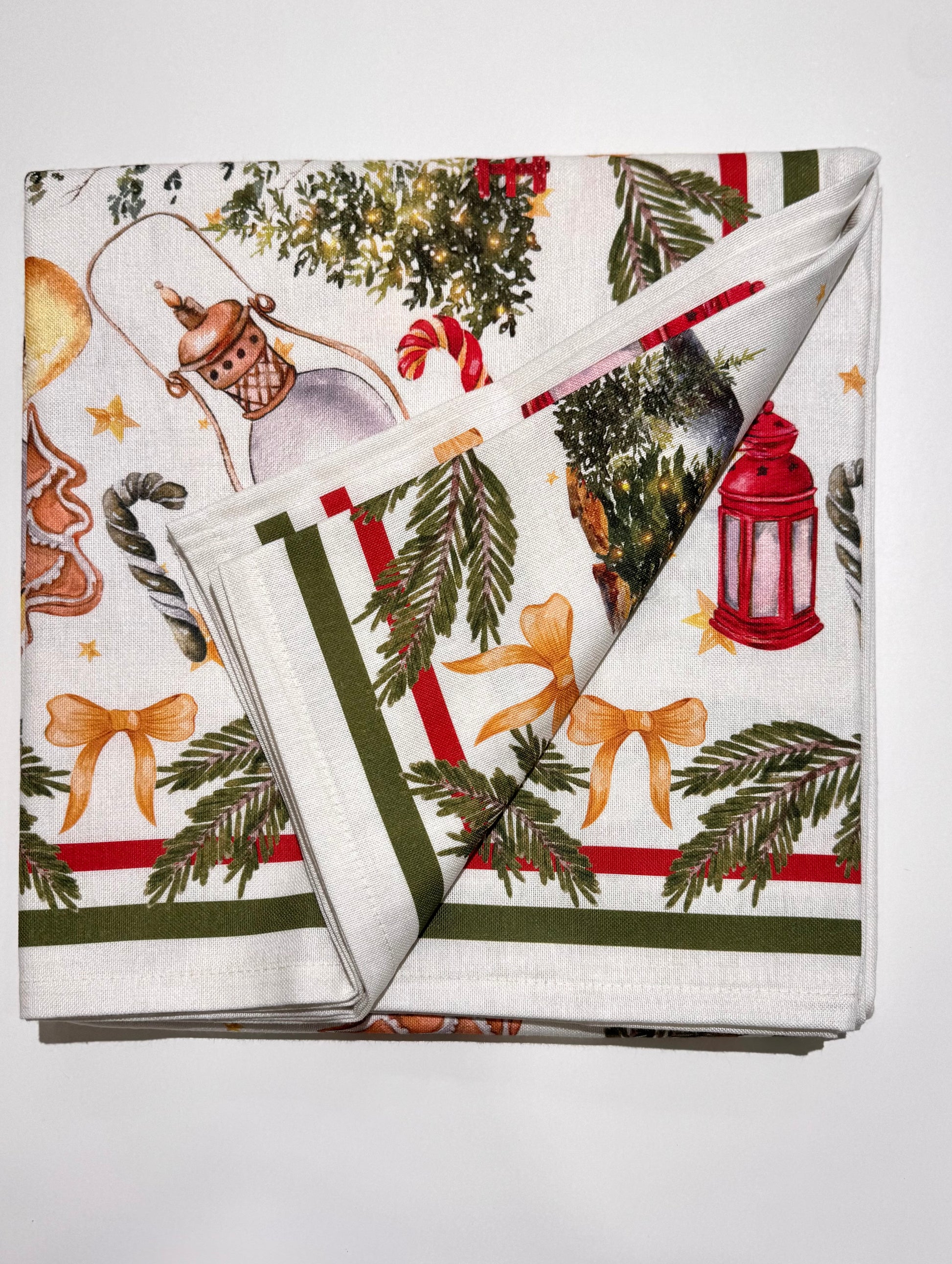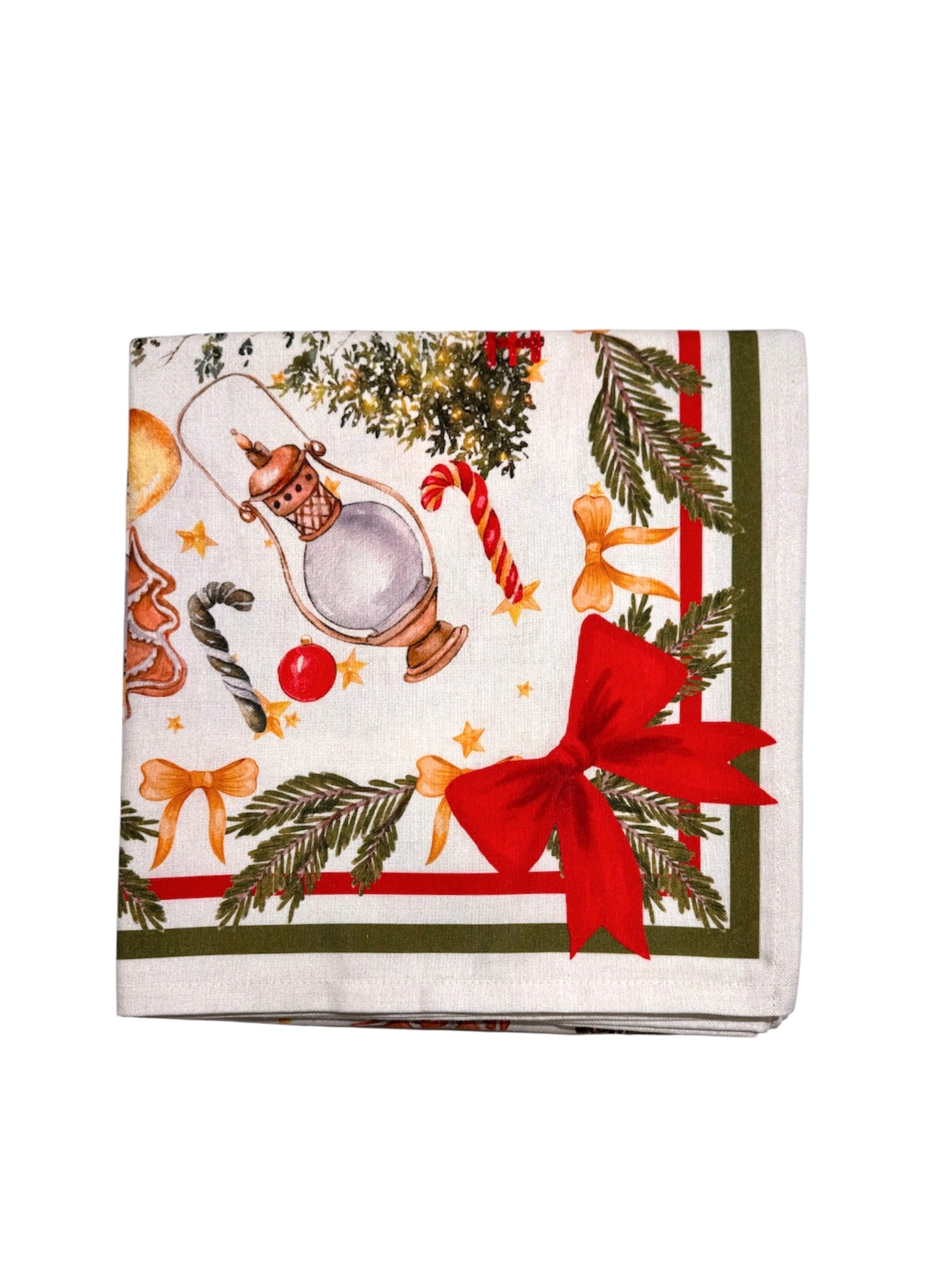 TOVAGLIA NATALIZIA WINTET HOUSE natalizia piazzata con elegante fantasia di casette e alberi di Natale, perfetta per creare un’atmosfera calda e festosa. Realizzata con tessuto di qualità, unisce praticità e stile per rendere unica la tua tavola durante le feste.