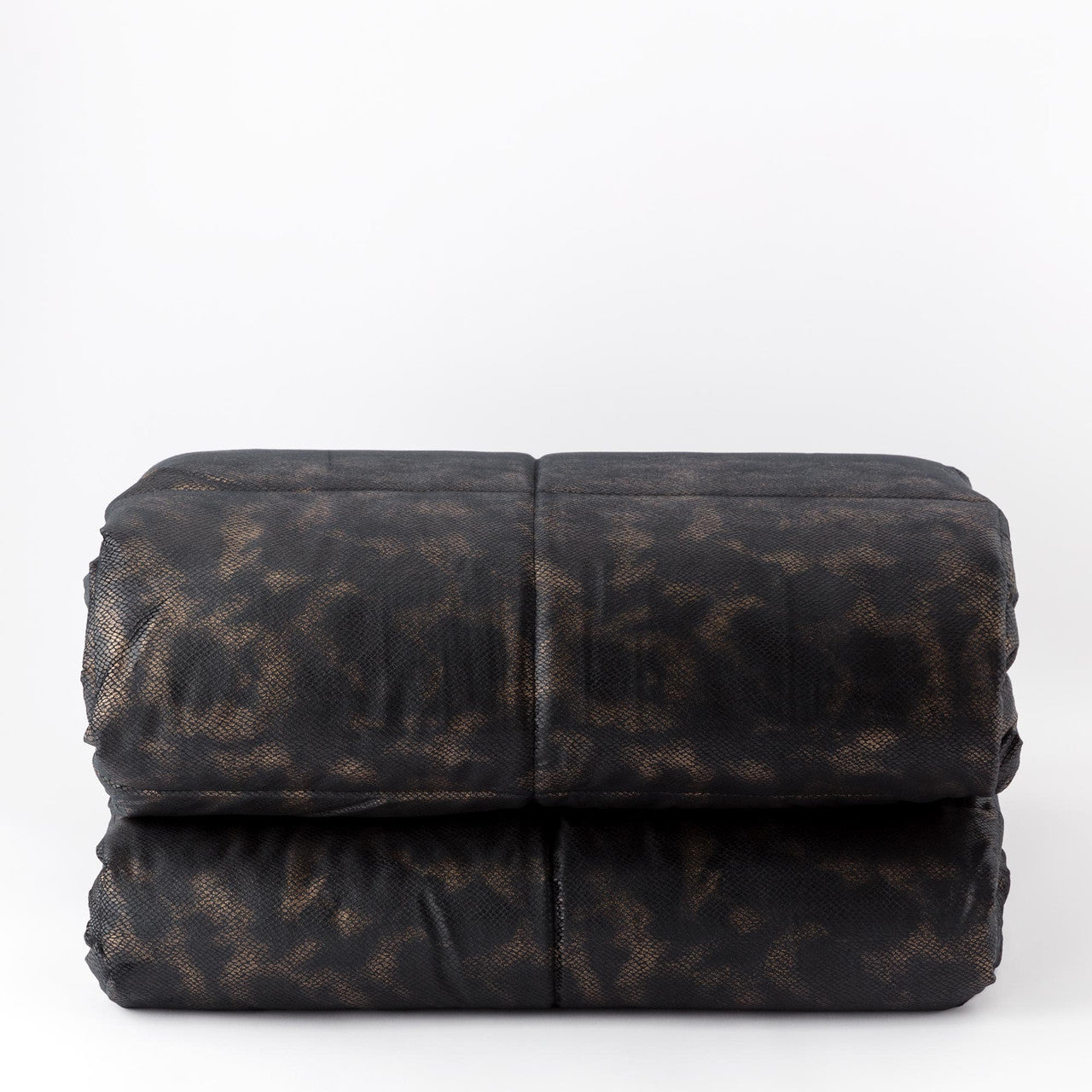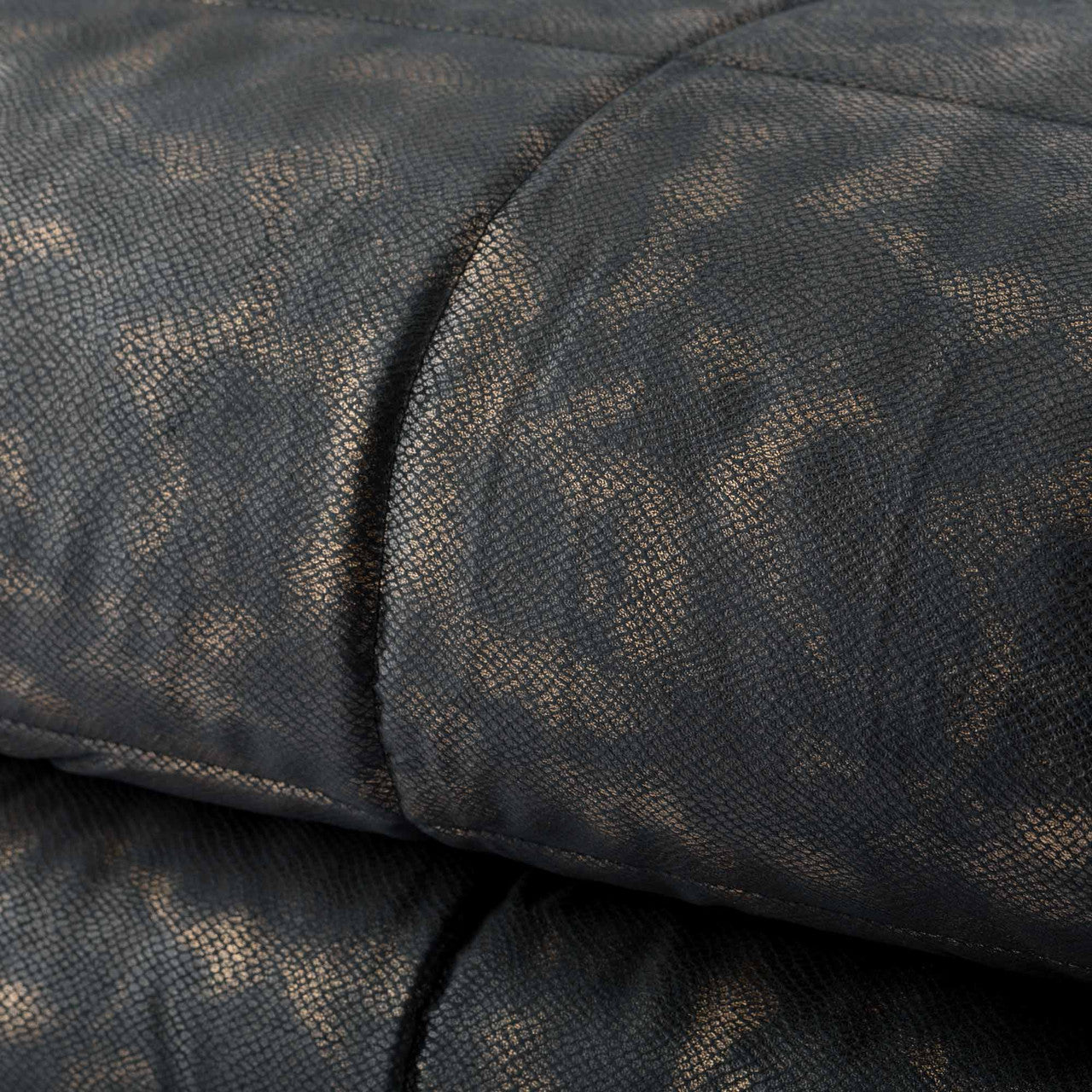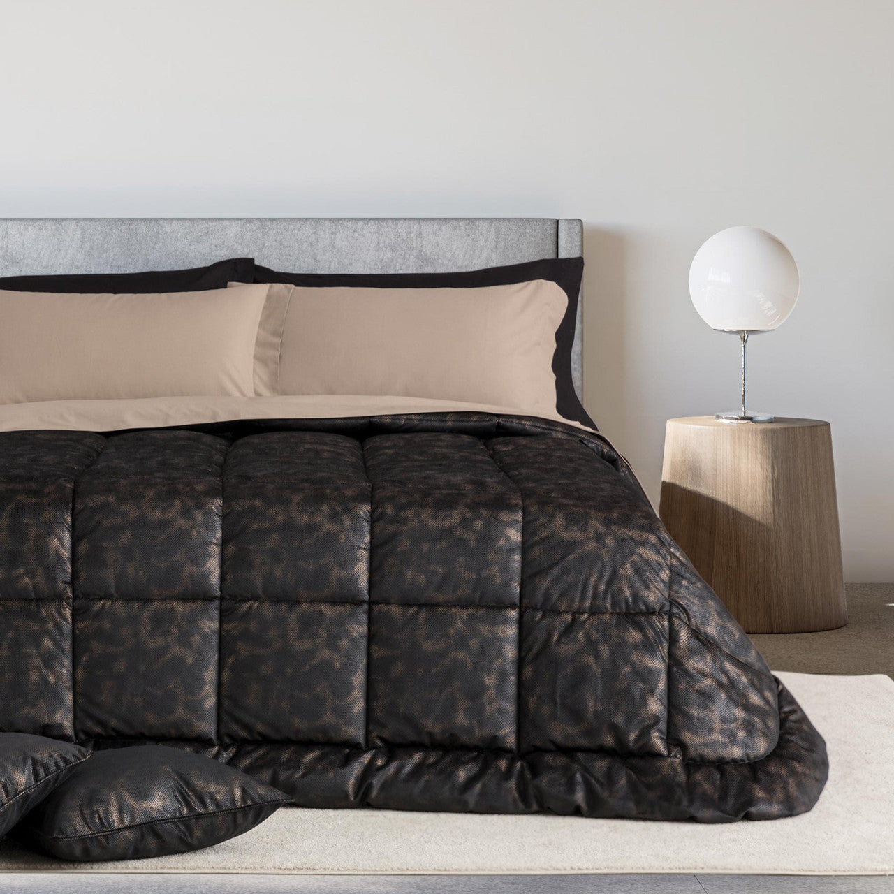 Fronte velluto con stampa foil oro e retro microfibra tinta unita, la trapuntatura a capo a rombi 1 cornice con angoli tondi; la trapunta ha un'imbottitura supersoft di 350gr 100% poliestere.