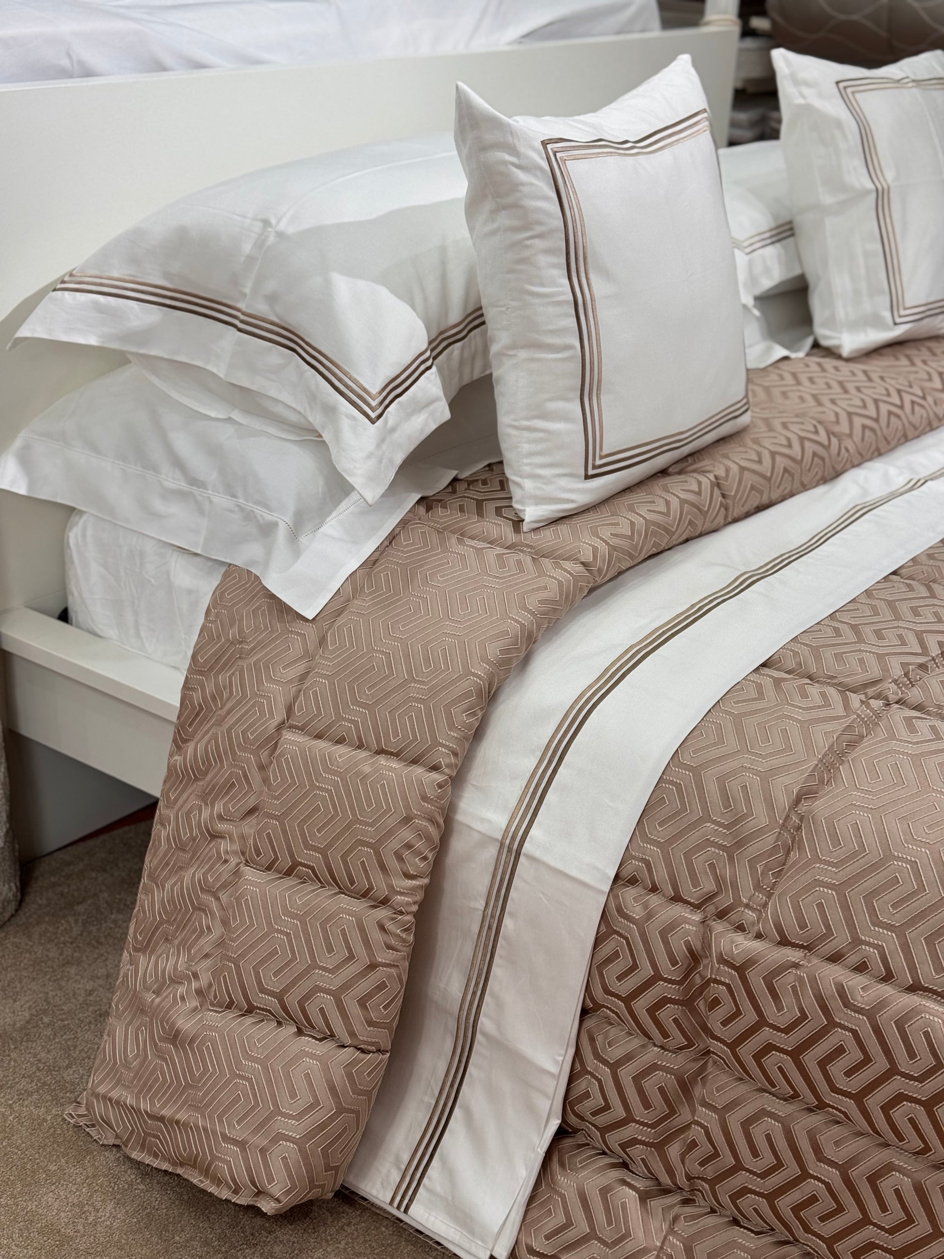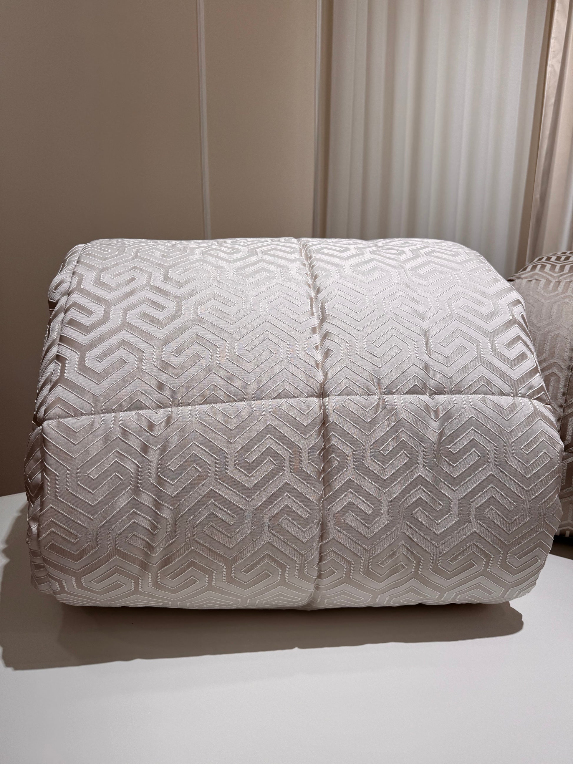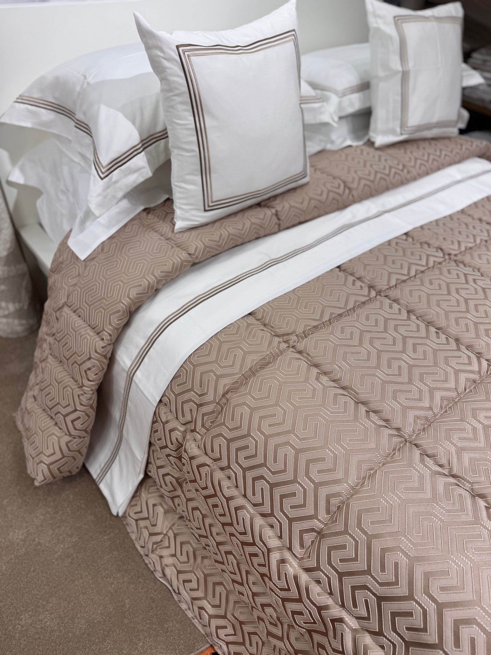 La trapunta invernale LABIRINT unisce stile e qualità grazie al suo prezioso disegno jacquard e alla morbidezza del raso.