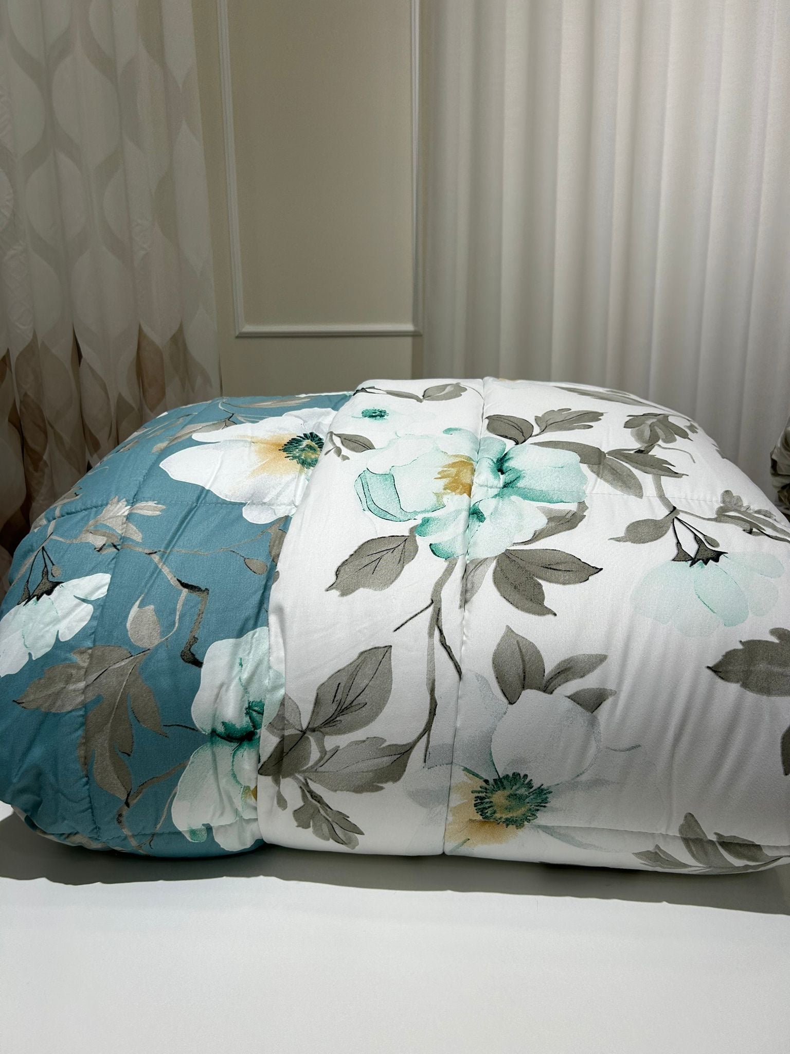Trapunta matrimoniale stampata CLERIS con elegante fantasia floreale. Realizzata in 100% poliestere, con imbottitura da 350 gsm, ideale per le stagioni fredde.