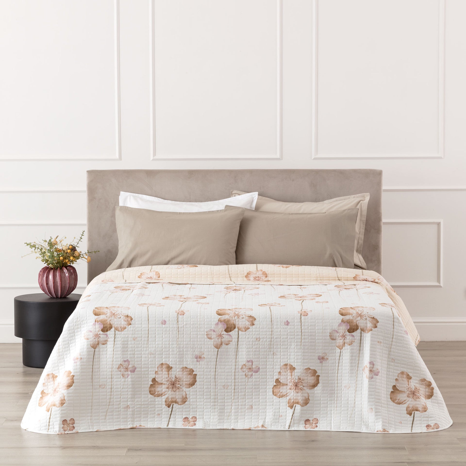 La stessa romantica fantasia floreale del completo letto Ayla si declina in una versione double face.